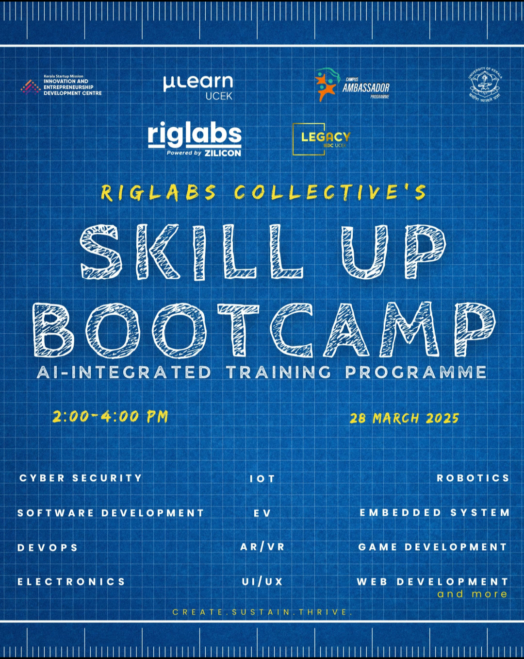 *Elevate Your Skills at the Skill Up Bootcamp!* Step into the future of technology with Riglabs Collective's Skill Up Bootcamp Brought to you by *Legacy IEDC UCEK*, and *μLearn UCEK* an AI-integrated training program designed to equip you with in-demand skills in _• Cyber Security_ _• Software Development_ _• IoT_ _• Robotics_ _• Embedded Systems_ _• Game Development_ _• Web Development, and more!_