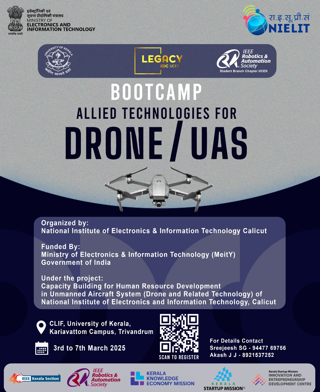 🚀 *The Future is Airborne: Drone & UAS Tech Bootcamp!* *Why Join This Bootcamp?* *Join the Mega Drone Workshop—a cutting-edge event powered by NIELIT Calicut, in collaboration with Kerala Startup Mission, IEEE Kerala Section, IEEE RAS Kerala Chapter, and Kerala Knowledge Economy Mission (KKEM). Hosted by Legacy IEDC UCEK and IEEE RAS SBC UCEK in association with Kerala University Business Innovation and Incubation Centre (KUBIIC). Funded by MeitY, Govt. of India, this workshop is your gateway to mastering drone technology with industry leaders.* This hands-on bootcamp is designed for tech enthusiasts, engineers, startups, and industry professionals looking to stay ahead in the drone revolution.