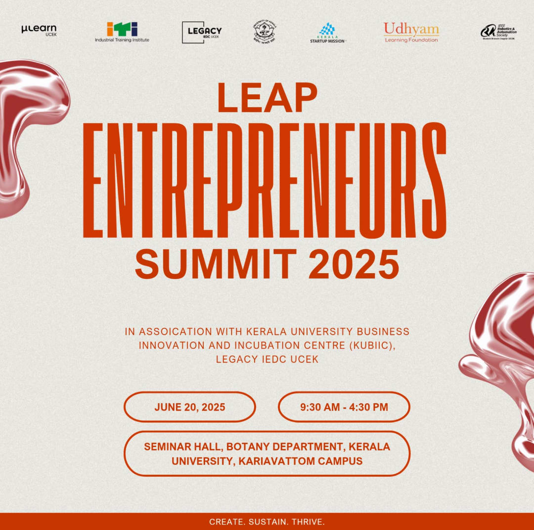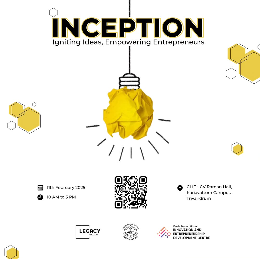 INCEPTION: A Bootcamp on Startup, Innovation & Entrepreneurship Join us for INCEPTION, an exclusive workshop designed to ignite the entrepreneurial spirit among students! The bootcamp is jointly organised by KUBIIC(Kerala University Business Innovation and Incubation Centre) & Legacy IEDC UCEK supported by University of Kerala. This workshop will provide valuable insights into startups, innovation and entrepreneurship, helping you turn ideas into reality.