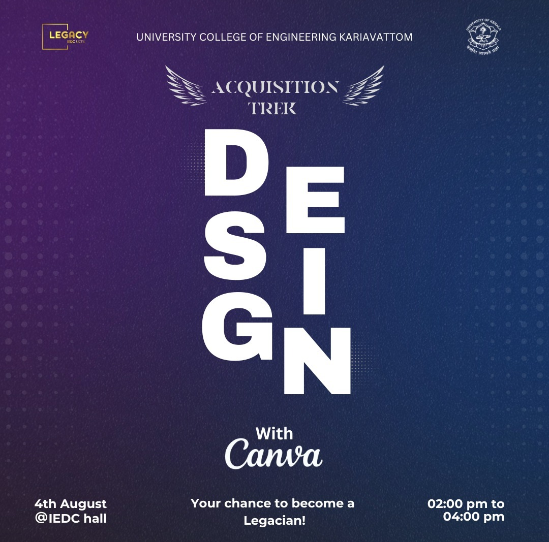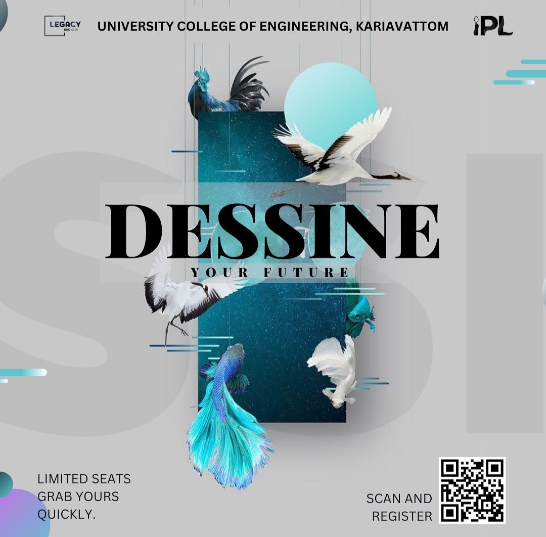 "Design can be art. Design can be aesthetics. Design is so simple, that's why it's so complicated." – ✒️ Paul Rand To tackle out all those complications and help you kick start your journey as a designer, ⚜️ LEGACY IEDC UCEK proudly presents DESSINE Your Future ⚜️ 💡 We assure to help you broaden your horizons on the topics listed below: 📌 Introduction to designing 📌 Branches of designing and tools 📌 How to build your career as a designer 📌 Designing thought process 📌 How to become a professional in minimum time .