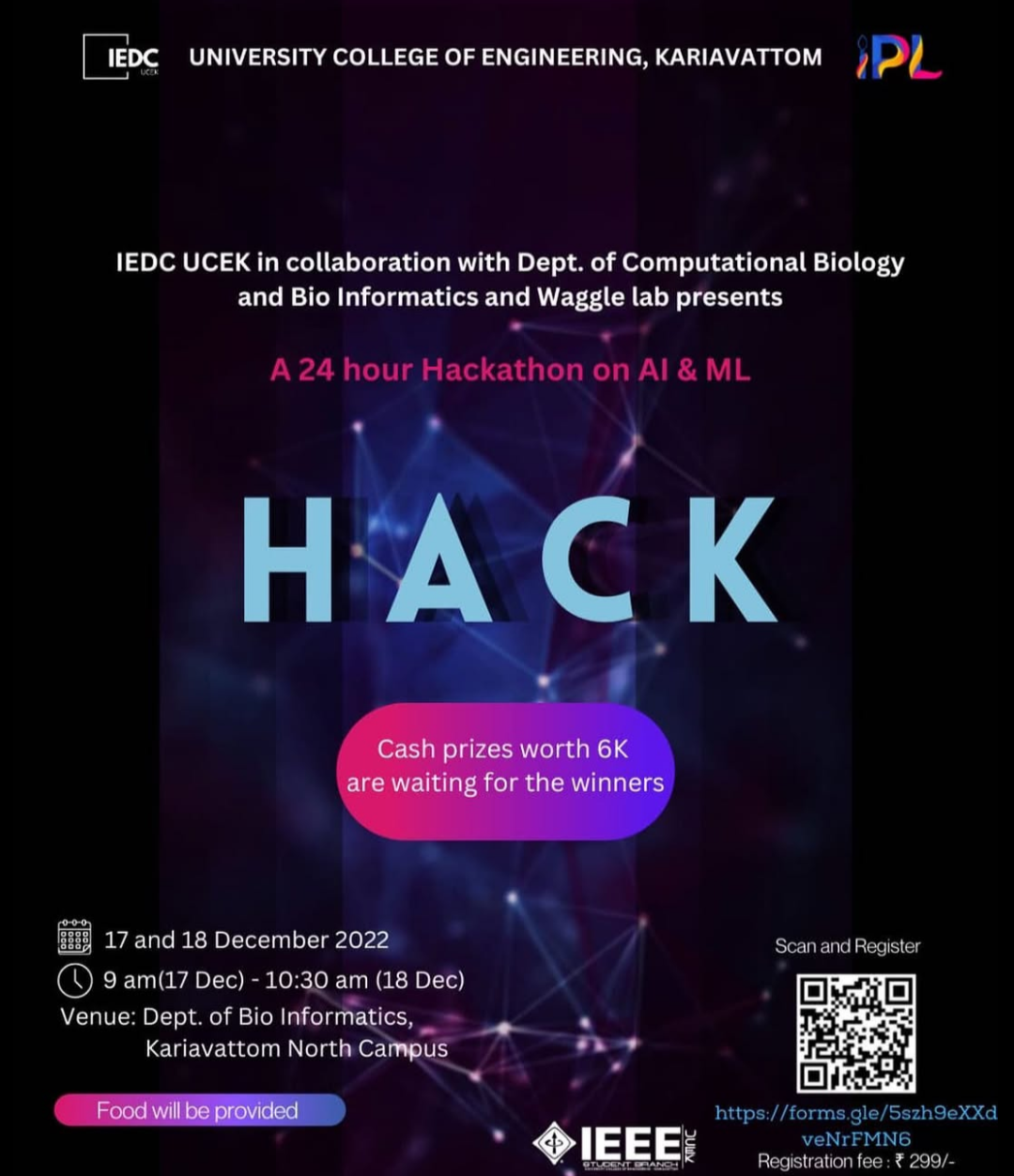 "Discover and solve with AI and ML" IEDC UCEK in collaboration with Department of Bioinformatics, Kerala University and Waggle Labs is conducting "Hack" - a 24Hr Hackathon where you can showcase your programming skills. Winners will receive prizes from a cash pool of 6K. Selected teams will also have the opportunity to receive mentorship. Theme: Agriculture Sustainable Development Healthcare ⚠️ Guidelines: Team must consist of 3–4 members only All team members must register individually Ensure that all team members enter the same 'Team name' Green Protocol must be strictly followed Team must bring their necessary tools Problem statements will be provided at the start of the event Registration Fee: ₹299 Per Participant.