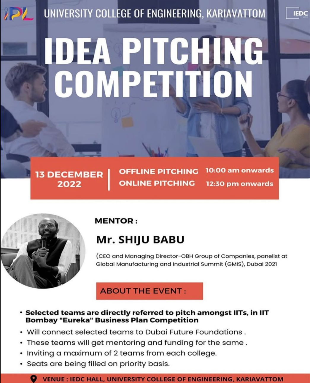 Knock Knock, who is it? It's your opportunity to pitch amongst IITs in IIT Bombay "Eureka" Business Plan Competition (Prize pool of INR 65+ Lakhs). Mr. Shiju Babu (CEO and Managing Director - OBH Group of Companies, panelist at Global Manufacturing and Industrial Summit (GMIS), Dubai 2021) has offered to panel a screening B-plan round. He has been given veto power directly from IIT-Bombay to select and recommend a limited number of teams to pitch directly in "Eureka". Moreover, Mr. Shiju will connect selected teams to Dubai Future Foundation of which he is a member. These teams will get mentoring and funding from the same
