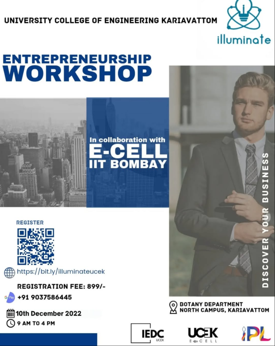 “THE BEST WAY TO PREDICT THE FUTURE IS TO CREATE IT.” – PETER DRUCKER Hey folks💖 Are you looking forward to becoming a successful entrepreneur? Don't worry! Here's an opportunity knocking... You wanna know what it is? Illuminate – the offline workshop based on entrepreneurship organized by E-Cell IIT Bombay in association with IEDC UCEK & E-Cell UCEK. We provide: Certificate of completion by E-Cell IIT Bombay Professional kit, Resources, Evocative books Awareness about entrepreneurship, scripting a Business Model, Marketing and Finance Speaker session by experts and real entrepreneurs, case study training, hands-on experience with business model Get a chance to attend E-Summit 2023