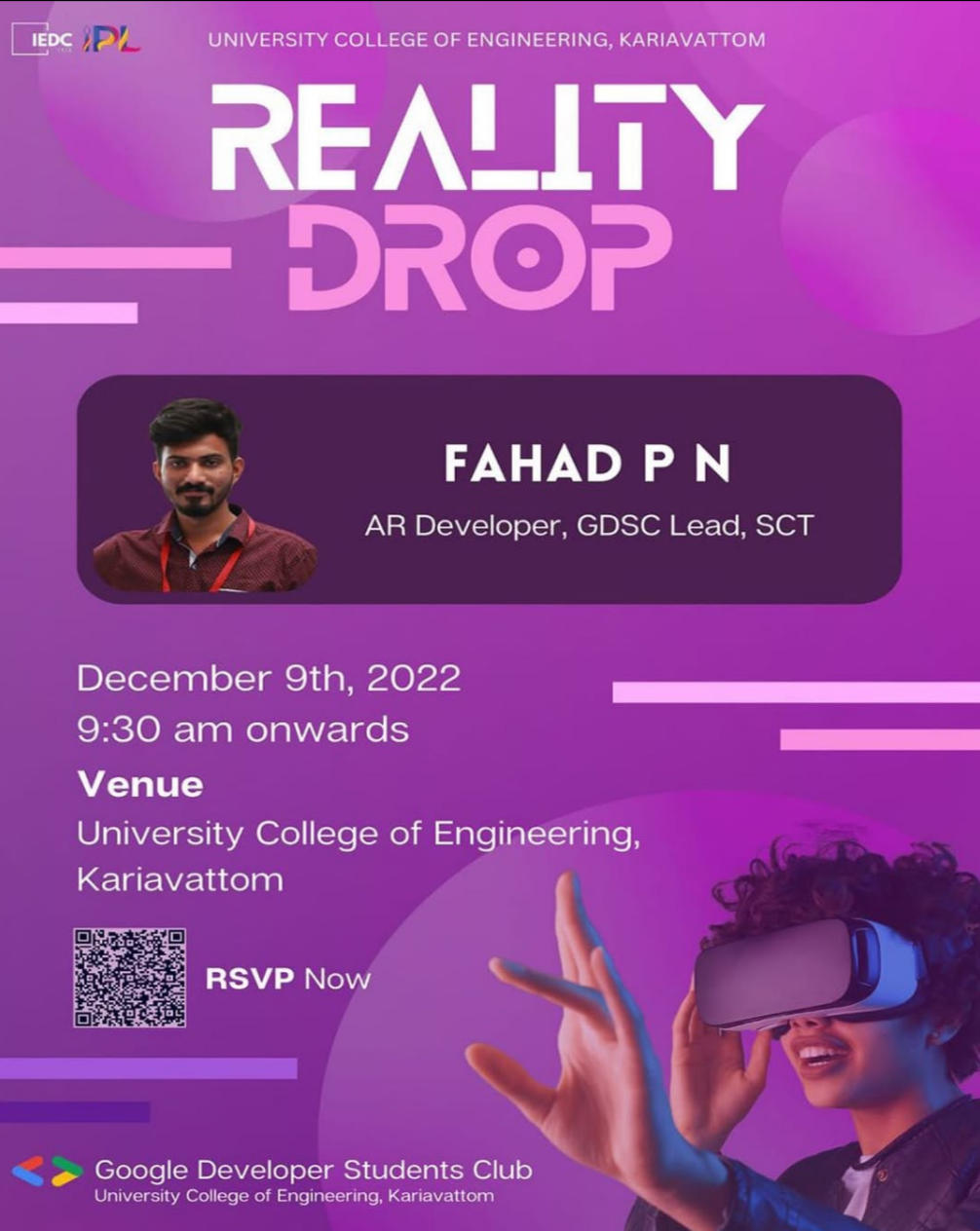 What do you think the future of Augmented Reality will look like?🤔 As AR technology slowly becomes more integrated into our everyday lives, we can only imagine the possibilities of what the future will hold. This innovative technology can bridge the gap between the digital and physical worlds by bringing digital information into the latter and giving users a real-time experience. GDSC UCEK in collaboration with IEDC UCEK is presenting you all with an amazing opportunity to know so much more about Augmented Reality. ✨REALITY DROP✨ This session will be facilitated by Mr. Fahad P N, an AR Developer and currently the GDSC Lead of SCT. He has taken so many talk sessions for a large audience and is a skilled developer. 💻 Register Now: https://tinyurl.com/Reality-Drop