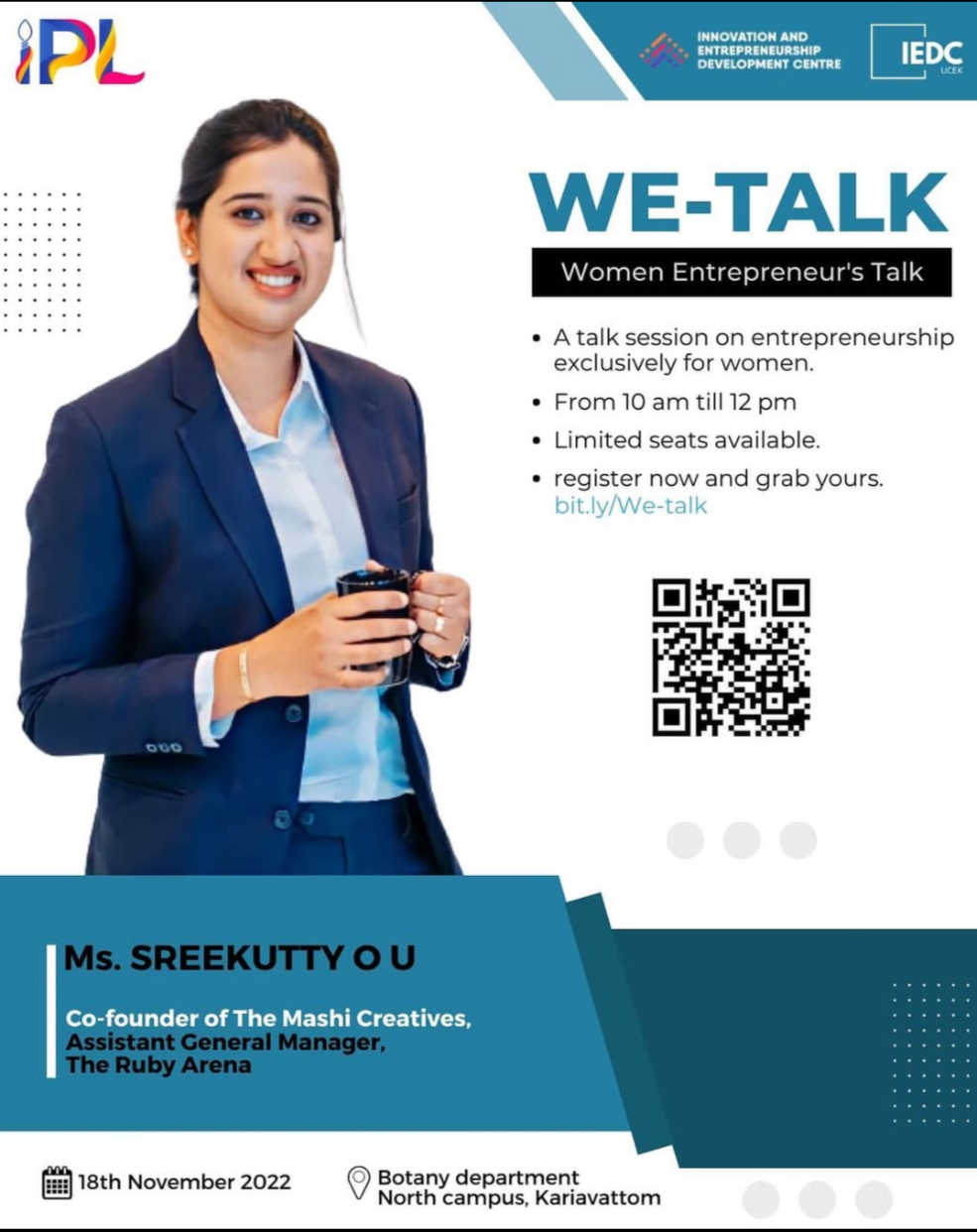 "There is no limit to what we, as women, can accomplish" – Michelle Obama Hey you, here's something interesting. IEDC is celebrating this year's Women’s Entrepreneurship Day by conducting a talk session just for the budding women entrepreneurs out there! This is your window of opportunity to interact with Ms. Sreekutty O U, Co-founder of Mashi Creatives, Assistant General Manager of The Ruby Arena, and learn your tips and tricks to be the best among all! WE Talk