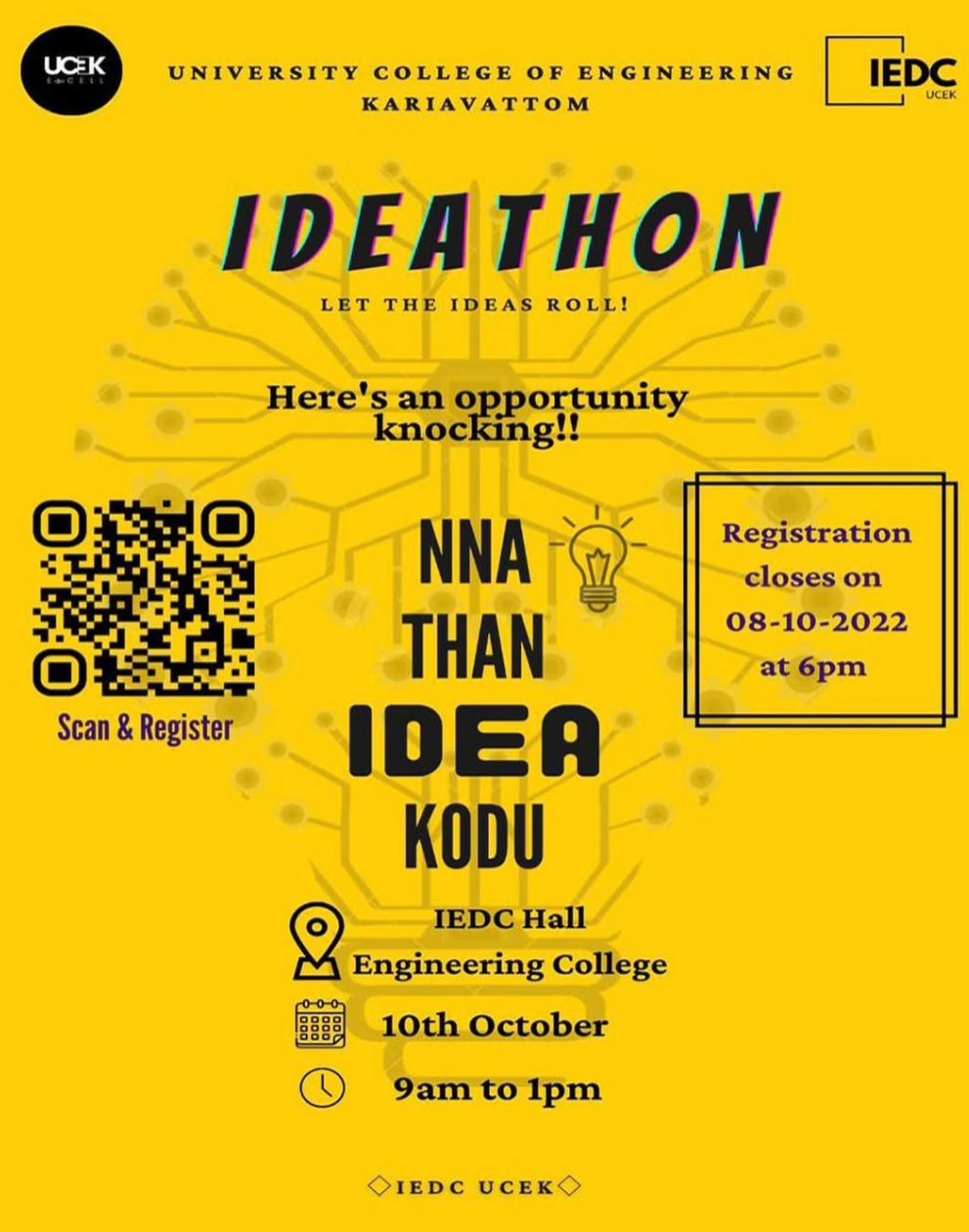 “The value of an idea lies in the using of it “ –Thomas Edison Greetings from E-Cell UCEK IEDC-UCEK in collaboration with E-CELL UCEK is ready to welcome your next big ideas💡 We present to you ‘Nna than idea kodu’ Share your ideas to kick-start your entrepreneurship journey with us to boost your: • Creative working space • Networking opportunities • Connections with mentors and advanced business trainings So what are you waiting for? Do a brainstorm 🧠💪 and send us your unique ideas… 📅 The final pitch is scheduled on 10th of this month.